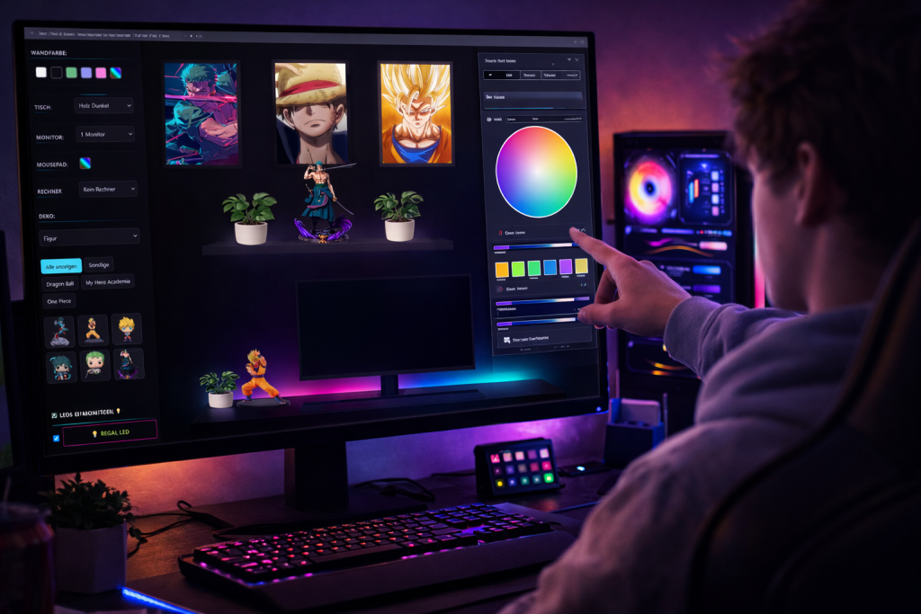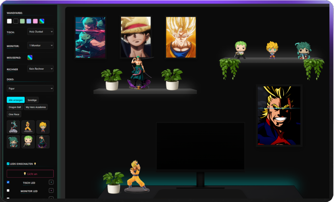 Du stellst Monitore, Möbel, Hardware, Dekoration und Beleuchtung direkt im Browser zusammen und siehst sofort, wie alles zusammen wirkt.